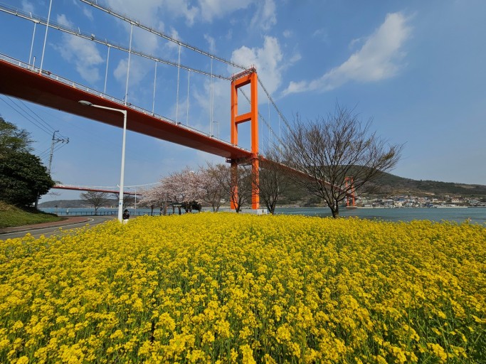 | 꽃길 포토존 | 유채꽃과 벚꽃을 배경으로 사진 촬영 | 남해 꽃밭길 |